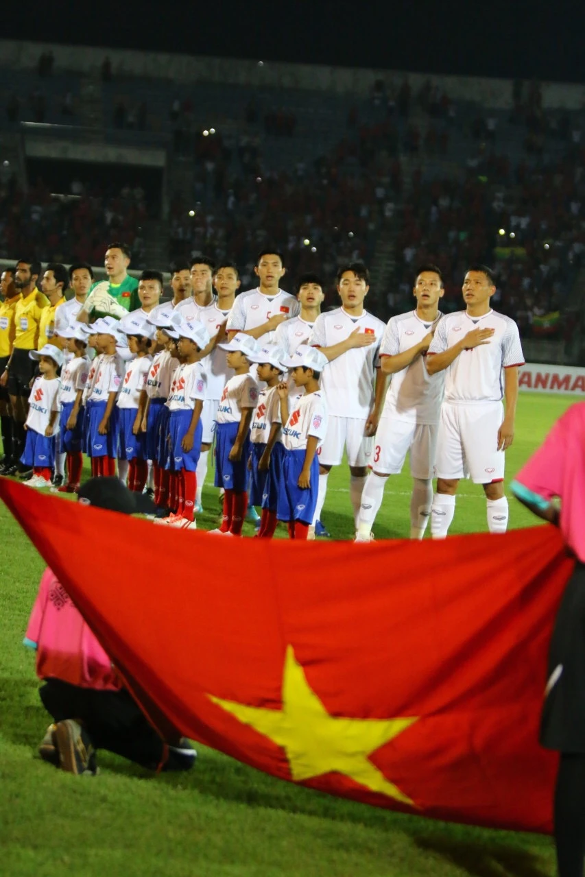 Ở trận đấu này, đội khách Việt Nam ra sân với trang phục toàn trắng còn Myanmar thi đấu với trang phục toàn đỏ.