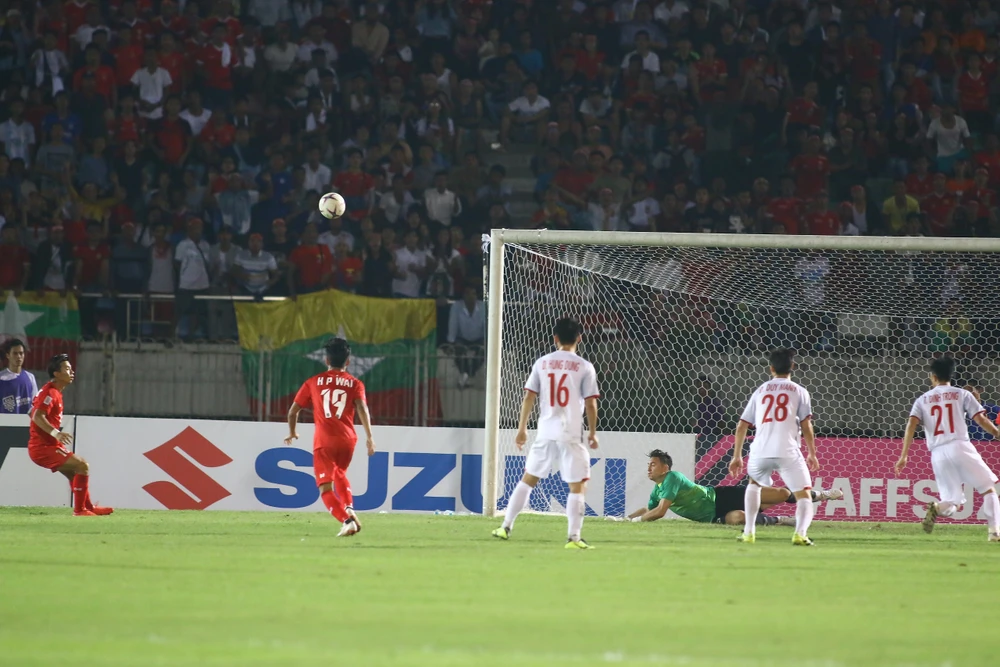 Phút 35, từ quả đá phạt góc, Myanmar tạo ra tình huống sóng gió về phía khung thành Việt Nam với liên tiếp hai, ba pha dứt điểm nhưng không có bàn thắng nào cho chủ nhà.