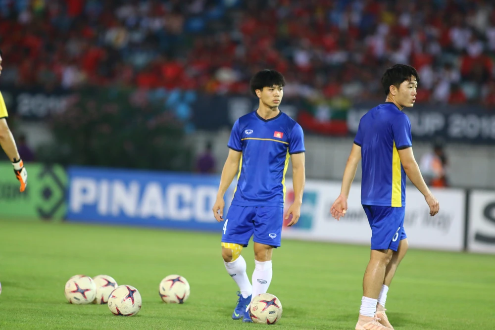 10 phút đầu tiên của trận đấu trôi qua, Việt Nam có phần nhập cuộc thận trọng và nhường quyền kiểm soát bóng cho chủ nhà Myanmar.
