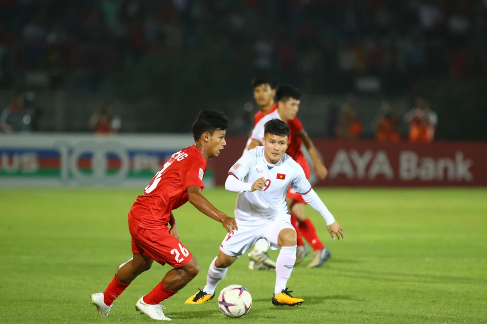 Văn Đức đi bóng trước sự đeo bám của cầu thủ Myanmar. ẢNH: TRÂM ANH