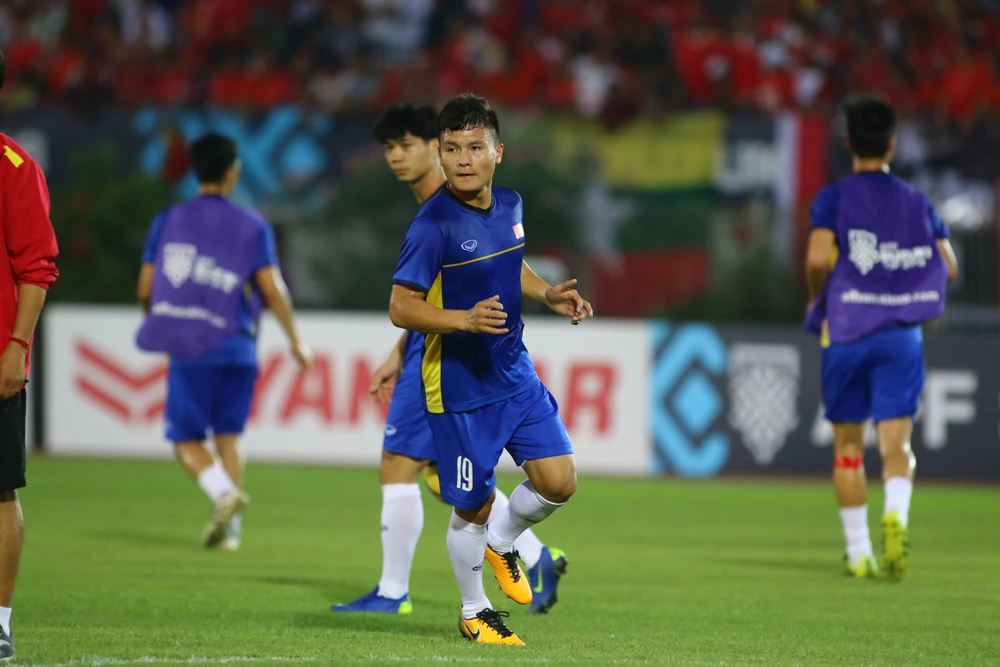 Như vậy, đội hình ra sân của Việt Nam gồm Văn Lâm trong khung thành, bộ ba trung vệ quen thuộc Ngọc Hải, Đình Trọng và Duy Mạnh. Hai cánh sẽ là Văn Hậu và Văn Đức. Hàng tiền vệ có Xuân Trường, Quang Hải, Văn Quyết. Trên hàng công là Công Phượng và lão tướng Anh Đức sẽ đá cao nhất.