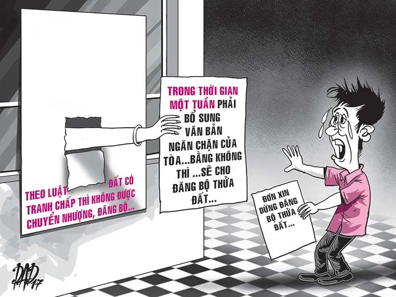 Hôm nay (5-5), ông TS (phường 10, quận 10, TP.HCM) phải cung cấp văn bản ngăn chặn của tòa thì Chi nhánh Văn phòng Đăng ký đất đai quận 9 (VPĐKĐĐ) mới ngưng đăng bộ. Ông chỉ biết kêu trời vì thời hạn VPĐKĐĐ đưa ra cho ông là không tưởng.