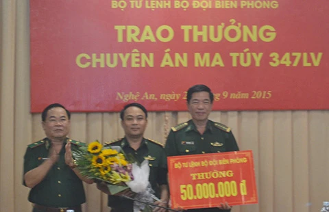 Sáng 21-9, Thiếu tướng Nguyễn Cảnh Hiền, Phó Tư lệnh BĐBP, đã biểu dương, tặng hoa và thưởng “nóng” 50 triệu đồng cho Ban chuyên án 347 LV thuộc BĐBP tỉnh Nghệ An.