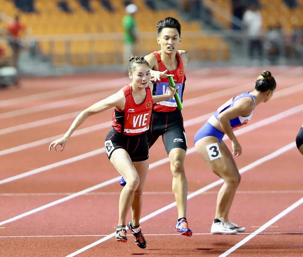Với thành tích 3’19”50, đội tiếp sức 4x400 m nam-nữ phối hợp Việt Nam thiết lập kỷ lục SEA Games mới cự ly lần đầu tiên được tổ chức.