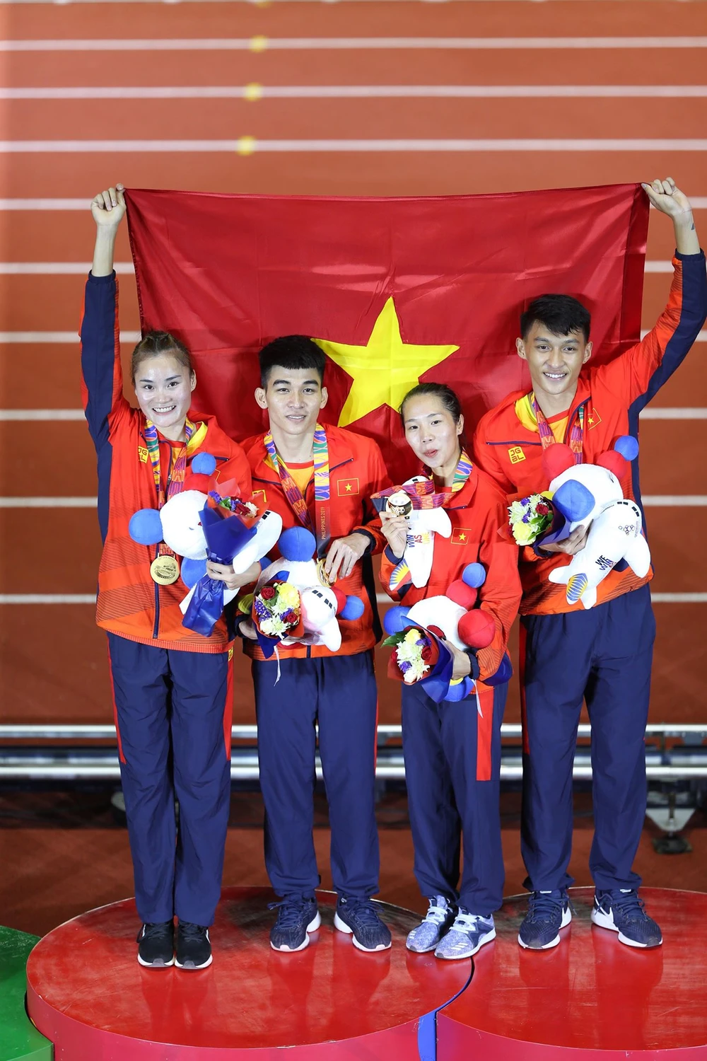 Quách Thị Lan, Trần Đình Sơn, Nguyễn Thị Hằng và Trần Nhật Hoàng trên bục nhận HCV 4x400 m tiếp sức nam-nữ. ẢNH: MINH QUANG