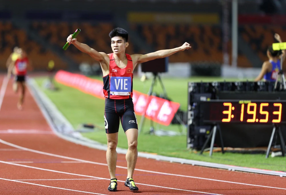 VĐV Trần Đình Sơn đóng dấu ấn đợt chạy cuối, giúp đội tiếp sức 4x400 m nam-nữ Việt Nam giành HCV ngoạn mục. ẢNH: MINH QUANG