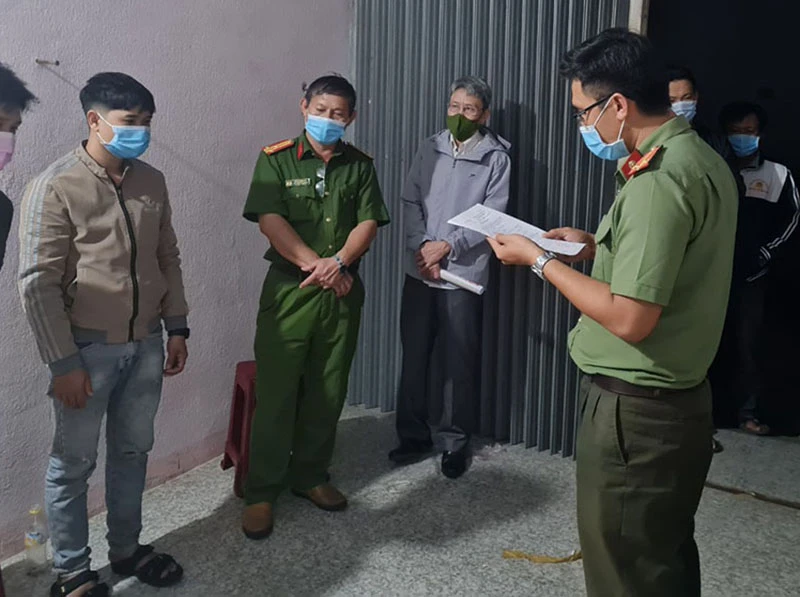 Cơ quan an ninh điều tra đọc lệnh khám xét chỗ ở của Nguyễn Hữu Lợi (bìa trái). Ảnh: CA