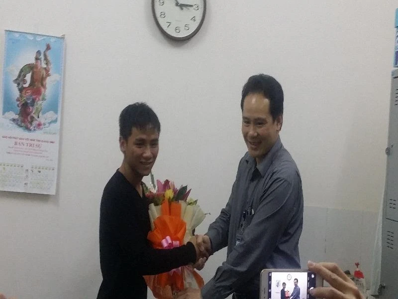 BS Nguyễn Hoàng Phúc tặng hoa cho Lê Hữu Toàn - người đạp xe xuyên Việt vận động hiến tạng