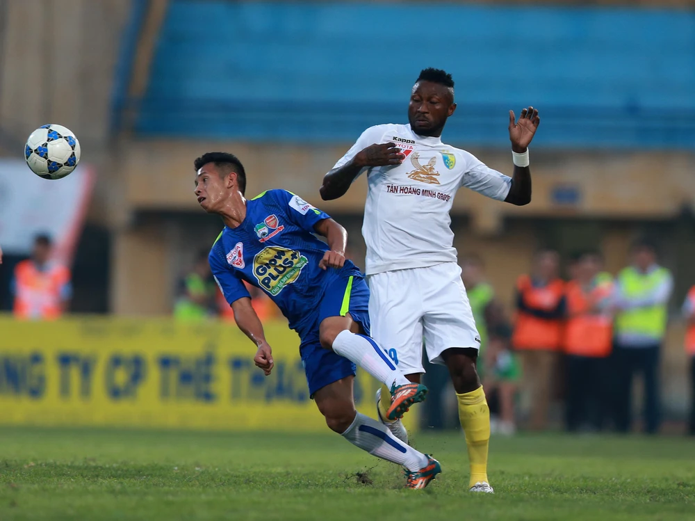 Chân sút Hoàng Vũ Samson (phải) đang dẫn đầu giải vua phá lưới không có tên dù anh rất khao khát cống hiến cho tuyển Việt Nam.