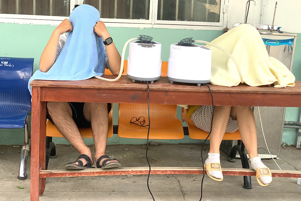 Các bệnh nhân được cho xông tinh dầu sả gừng để sát khuẩn đường mũi họng một ngày hai lần. Ảnh: HL