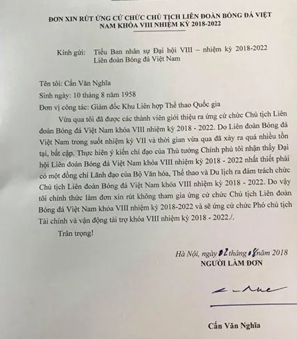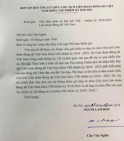 Trong đơn xin thôi ứng cử, ông Nghĩa viết: “Vừa qua, tôi đã được các thành viên giới thiệu ra ứng cử chức chủ tịch Liên đoàn Bóng đá Việt Nam (VFF) khóa VIII nhiệm kỳ 2018-2022. Do VFF trong suốt nhiệm kỳ VII và thời gian vừa qua đã xảy ra quá nhiều tồn tại, bất cập.
