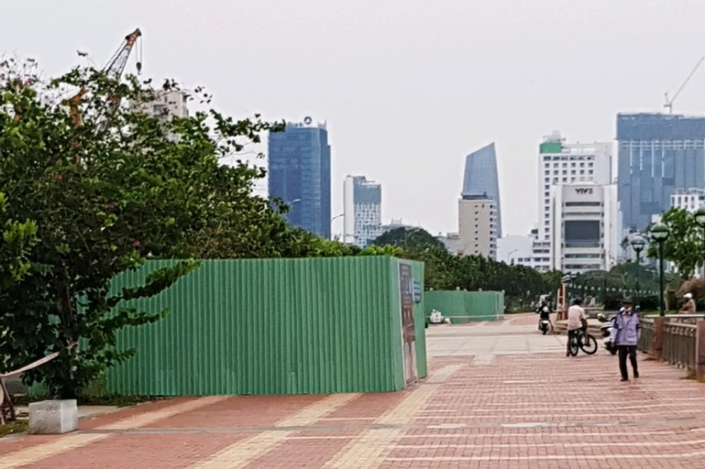 Chủ đầu tư dùng tôn rào lại những hạng mục đã thi công chợ đêm trong khi chờ quy hoạch mới. Ảnh: H.H