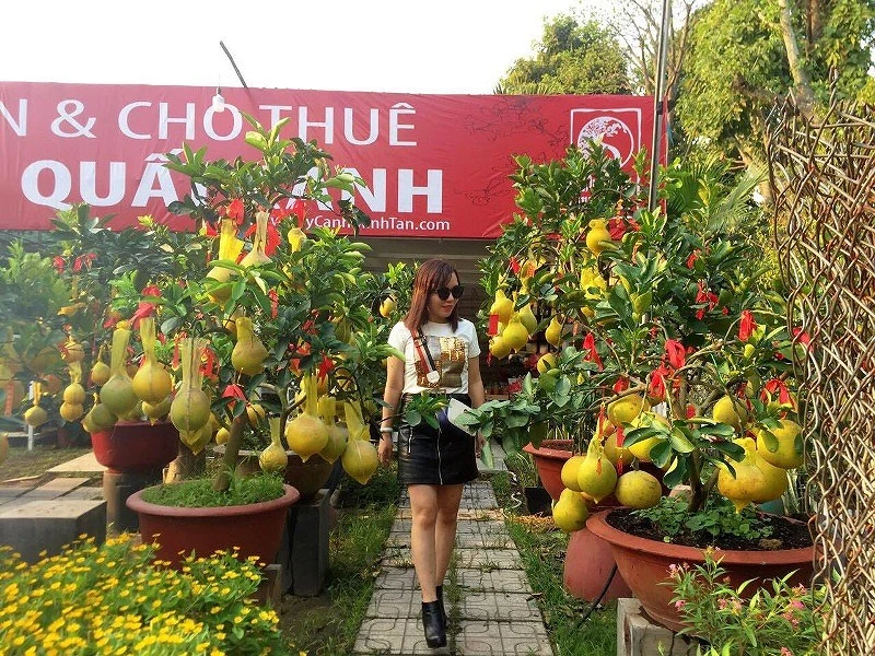 Tại vườn cây cảnh Minh Tân, đường Mai Chí Thọ, quận 2, TP.HCM, nhiều khách hàng ấn tượng với màu vàng óng, sai trái… của các chậu bưởi đẹp mắt.