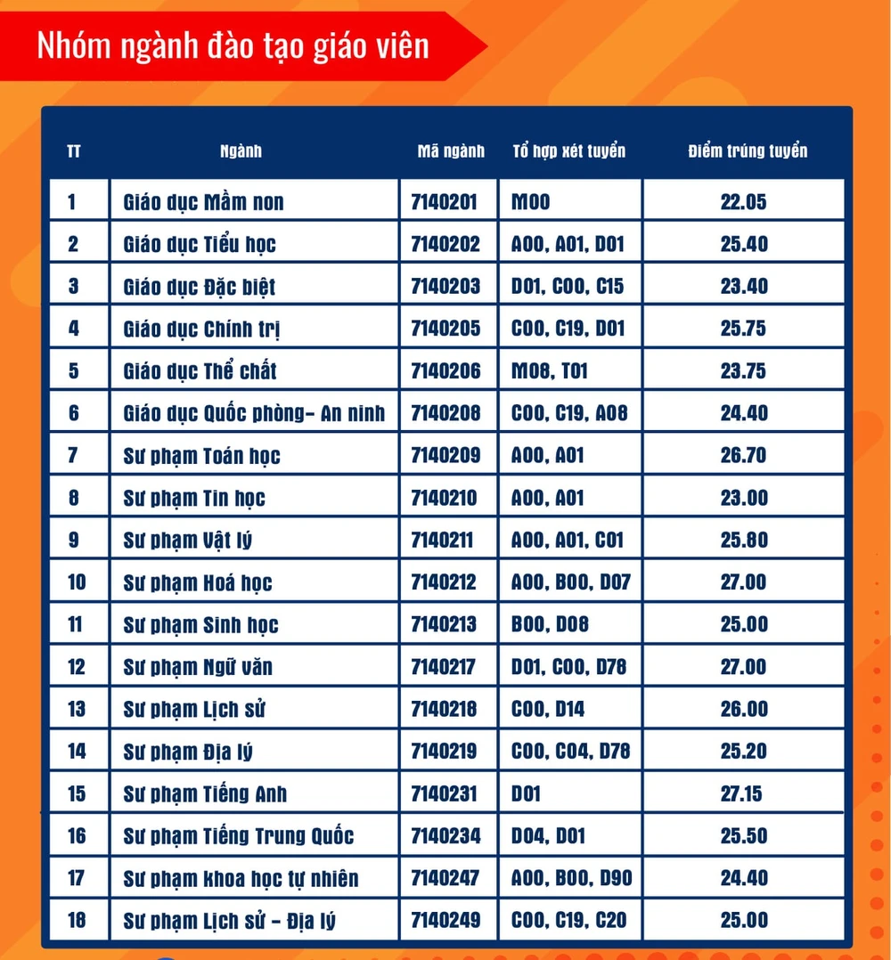 Đáng nói, nhiều ngành có điểm chuẩn trên 25. Trong đó, cao nhất là Sư phạm tiếng Anh với 27,15 điểm, kế đến là Sư phạm Hóa học và Sư phạm Ngữ văn ở mức 27 điểm.