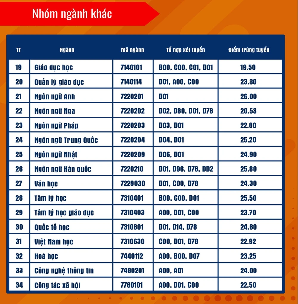 Riêng nhóm ngành ngoài sư phạm, điểm chuẩn năm nay cũng dao động từ 19,5 đến 26 điểm. Ngôn Ngữ Anh là ngành có điểm cao nhất.