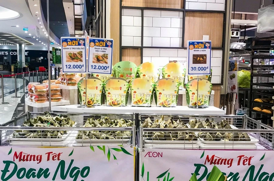 Tại siêu thị Aeon Tân Phú đã chuẩn bị sẵn các món ăn truyền thống của ngày mùng 5-5. Như bánh ú tro với ba loại nhân đậu đỏ, nhân đậu xanh, nhân dừa giá 12.000 đồng/cái, 140.000đồng/hộp 12 cái, xôi ngũ sắc 45.000 đồng/phần; chè trôi nước 25.000 đồng/ly…