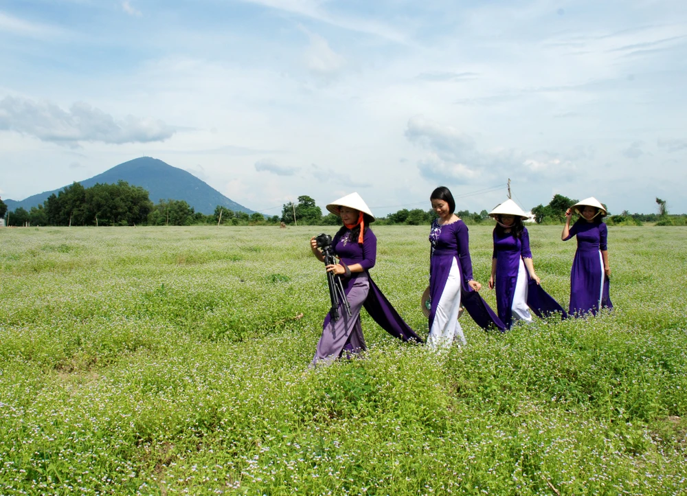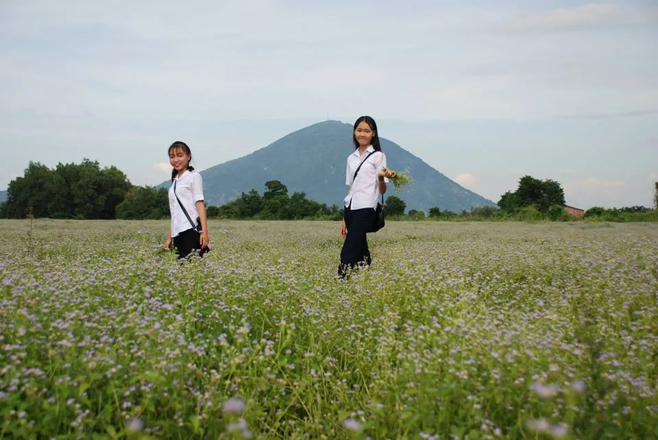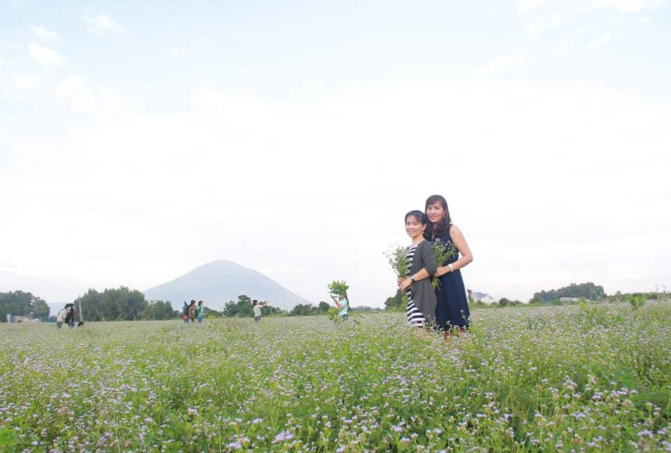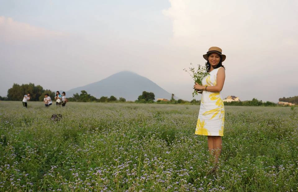 Một trong những người đầu tiên đến đây, chị Trúc Sương, chị ví cánh đồng hoa dại như đồng hoa cải trắng Mộc Châu. Phía sau cánh đồng là núi Bà Đen in bóng mình lên nền trời xanh thẫm, cảnh vật rất nên thơ.