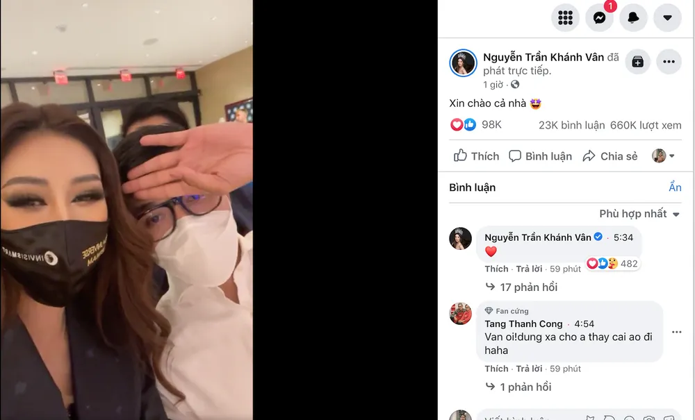 Trong cuộc trò chuyện phát sóng trực tiếp, nhiều người hâm mộ đã tới muốn chụp ảnh kỉ niệm cùng cô. Khánh Vân dù đói và mệt nhưng vẫn nán lại chụp hình cùng mọi người.