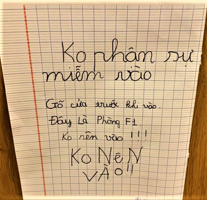 Bà Đặng Thị Hường ở TP Nha Trang (Khánh Hòa) phấn khích nói về cháu ngoại: “Vừa qua trong gia đình con gái tôi có 4 người thì 3 người bị F0, riêng thằng Panda (tên gọi cậu út trong gia đình) không bị nhiễm, thế là bố mẹ cháu bố trí cho Panda một phòng riêng đủ tiêu chí cách ly tế tại nhà, có sự theo dõi của y tế phường Ngọc Hiệp. Khi vào phòng riêng, cháu đã viết tờ giấy dán vào cửa ra vào với nội dung: Không phận sự miễn vào, gõ cửa trước khi vào, đây là phòng F1, không nên vào, KHÔNG NÊN VÀO!!!”.