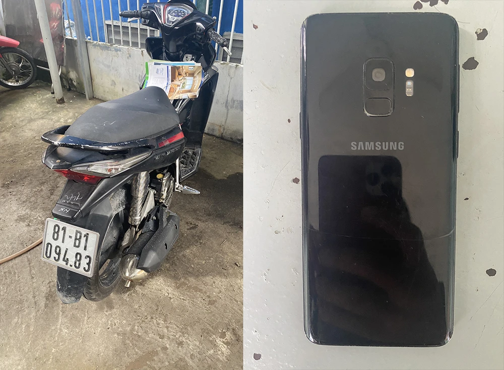 Điện thoại tang vật và xe máy hai người giả dạng phụ nữ dùng để đi gây án.