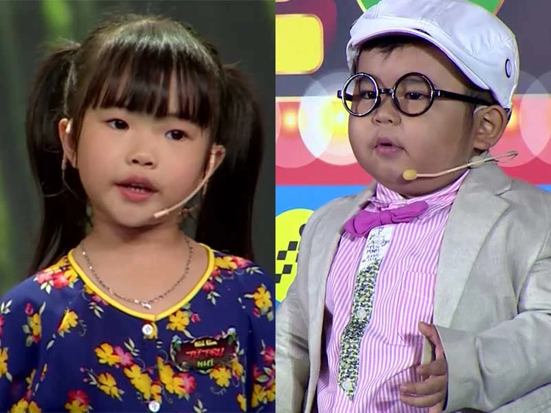 Bé Mai Vy (trái)mới bốn tuổi phải vào vai một bà nhiều chuyện, chanh chua trong chương trìnhTiếu lâm tứ trụ nhí (ảnh cắt từ clip); Ku Tin từng phải rời khỏi Thử tài siêu nhí vì sức khỏe sa sút dù chỉ mới hơn năm tuổi. Ảnh: BTC