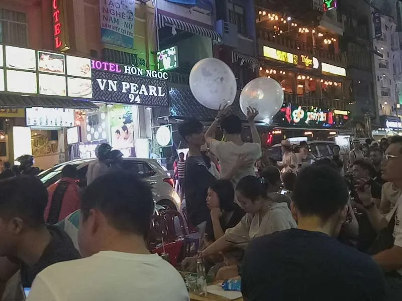 Lát sau, hai trái bóng cười to đùng được mang ra cho khách. Nhìn cảnh nhân viên quán hai tay cầm hai trái bóng cười giơ cao đem ra bàn, cùng các làn khói trắng shisha nhả ra liên tục từ các bàn bên cạnh, chúng tôi tưởng mình đang ngồi giữa một quán bar hoành tráng nào đó chứ không phải trên vỉa hè phố đi bộ Bùi Viện. Chỉ trong vòng 10 phút, có đến hơn 10 trái bóng cười lớn nhỏ được quán bán ra. Không riêng gì quán này, rất nhiều quán ở đây phục vụ bóng cười và shisha cho khách có nhu cầu.