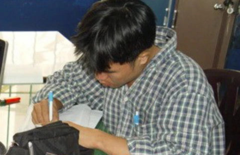 Nguyễn Tiến Long (Long “Bi”) đang viết bản tự khai tại cơ quan công an. Ảnh: CTV