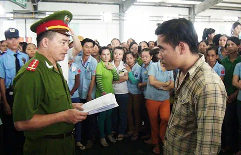 Công an đọc lệnh bắt tạm giam nghi can trộm giày tại Công ty Samho. Ảnh: XN
