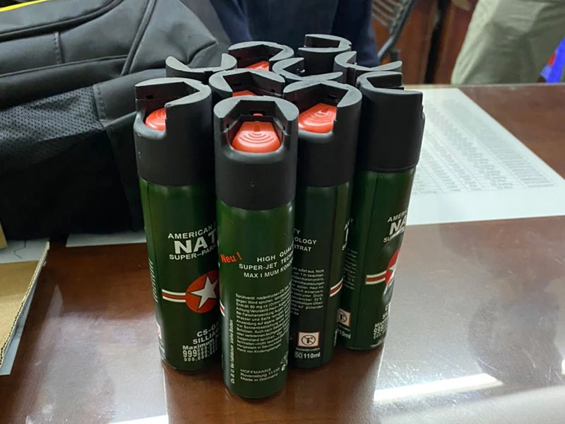 Các bình xịt hơi cay được thu giữ. Ảnh: N.TÂN