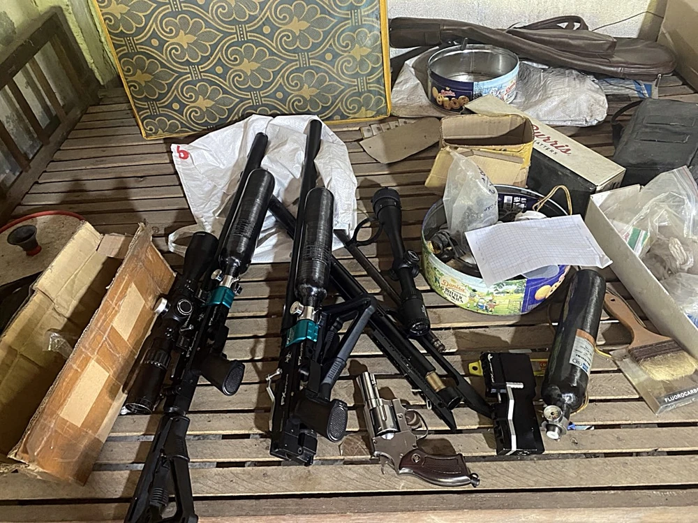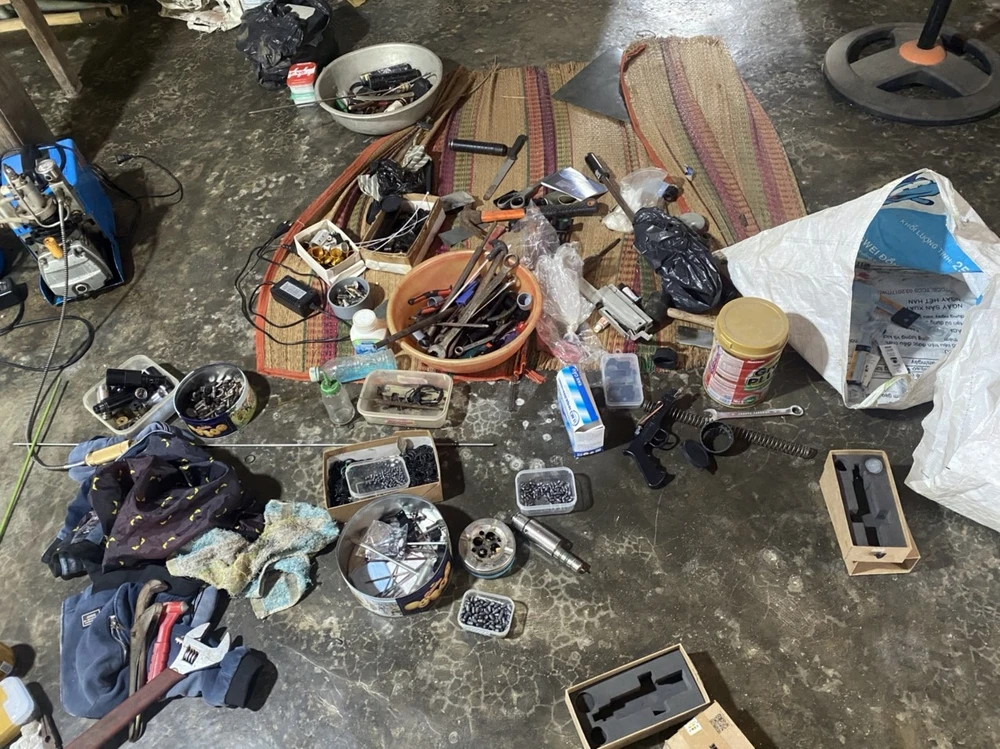 Ngoài ra công an còn phát hiện bảy hộp nhựa và bịch nylon bên trong có chứa nhiều viên kim loại hình tròn và nhiều viên đạn chì; hai báng súng bằng gỗ, nhiều phụ kiện (nòng súng, ống nhòm, ống giảm thanh, lò xo…) và dụng cụ để lắp ráp súng…