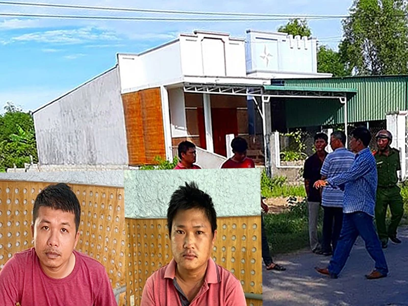 Công an thực nghiệm hiện trường vụ truy sát chủ tịch Hội Nông dân thị xã La Gi. Ảnh nhỏ (từ trái qua): Ngô Đức Thọ và Hồ Văn Cư. Ảnh: BPN