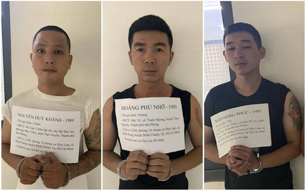 Những người bị tạm giữ gồm: Hoàng Phú Nhỡ, tự “Hoàng” (35 tuổi), Nguyễn Duy Khánh (31 tuổi) và Ngô Hồng Phúc (23 tuổi, cùng quê Hải Phòng). Ngoài ra, cơ quan công an đang củng cố hồ sơ để xử lý nhóm người này về hành vi cho vay nặng lãi.