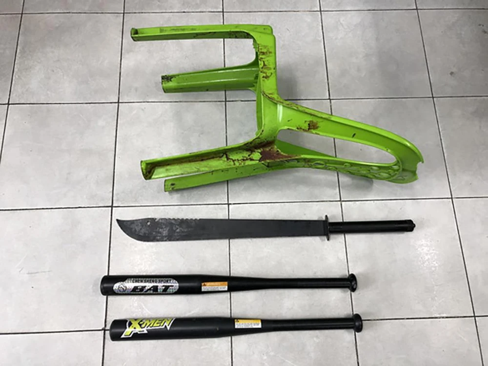 Tang vật gồm gậy đánh bóng chày, mã tấu và ghế bị công an thu giữ. Ảnh: CA