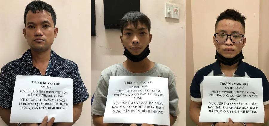 Ngày 21-1, Công an thị xã Tân Uyên, tỉnh Bình Dương cho biết đang tạm giữ Trương Ngọc Quí (23 tuổi), Trương Ngọc Tài (19 tuổi, cùng ngụ TP.HCM) và Thạch Khánh Lộc (33 tuổi, quê Sóc Trăng) để điều tra làm rõ hành vi cướp tài sản.