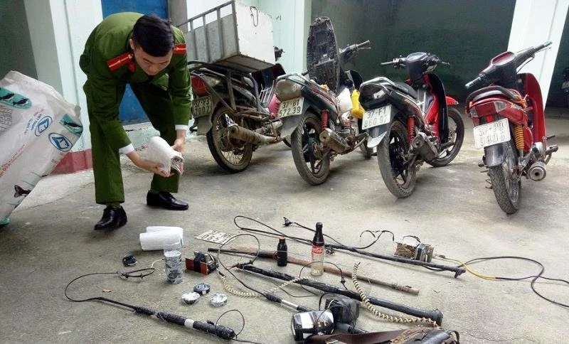Công an thị xã Thái Hòa đã thu giữ nhiều công cụ, phương tiện gây án gồm ô tô bảy chỗ Toyota Fortuner biển số 37A-221.82, sáu xe máy, 32 con chó, bốn bộ kích điện, ba chai bom xăng và một thanh kiếm.