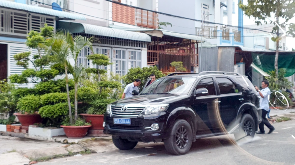 Lực lượng chức năng đưa người ra xe chuẩn bị rời khỏi nhà riêng của ông T. Ảnh: CHÂU ANH