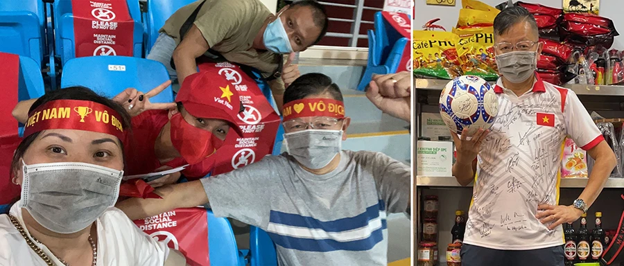 Vợ chồng chị Mai sau khi lo từng tô phở, tô hủ tiếu cho các tuyển thủ là đến sân cổ vũ (ảnh lớn). Và hạnh phúc với món quà quý mà thầy Park tặng. Ảnh: LÊ NAM