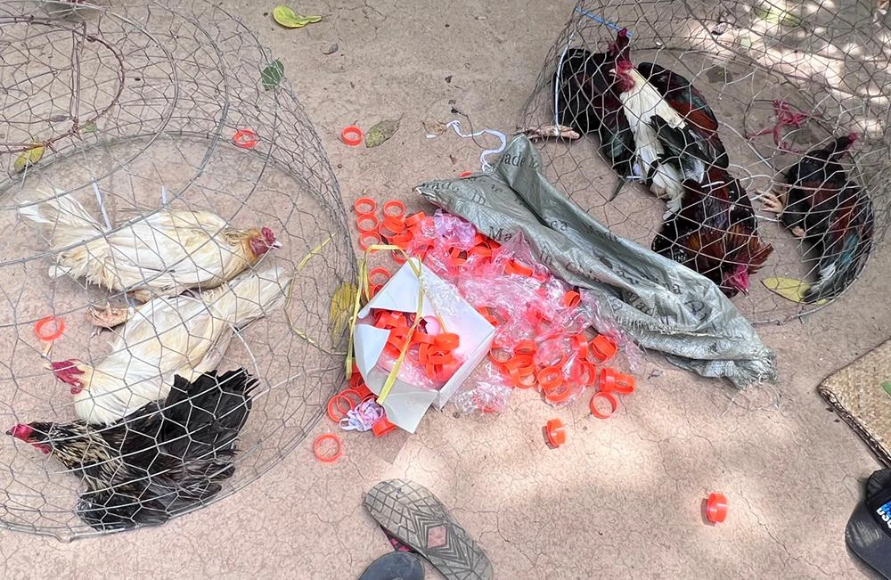 Những người chơi đá gà ăn tiền bị bắt quả tang cùng nhiều tang vật |