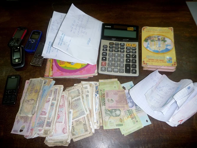 Tang vật thu giữ tại hiện trường gồm 3.870.000 đồng, 22 phơi ghi đề của 4 đài, 3 điện thoại di động, 1 máy tính tiền hiệu Casino, 3 quyển tập dùng để ghi số đề, 2 quyển sổ vò số kiến thiết cùng 5 xe mô tô các loại.