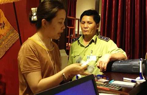 Cùng ngày, kiểm tra một cửa hàng kinh doanh đồ mỹ nghệ - hàng lưu niệm trên đường Nguyễn Thị Minh Khai do bà Phan Thị Tuyết Trinh đứng tên chủ hộ kinh doanh, đoàn kiểm tra cũng phát hiện nhiều sai phạm. Đây là showroom mà sáng 14-4 lực lượng bảo vệ đã chặn cửa, không cho một số phóng viên trong vai người mua hàng vào trong khi người TQ ra vào tự do. “Kiểm tra bước đầu cho thấy toàn bộ hàng hóa tại cửa hàng này không ghi nhãn. Nhiều hàng hóa có giá trên 1 tỉ đồng nhưng chủ hộ thừa nhận không xuất hóa đơn giá trị gia tăng khi bán. Ngoài ra, nhiều hàng hóa giá bán cao gần 2 tỉ đồng chỉ in nhãn bằng chữ TQ” - ông An nói.