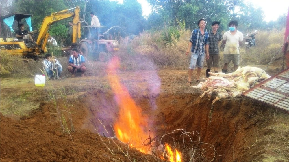 Cơ quan chức năng đang tiêu hủy gần một tấn heo bẩn. Ảnh: CTV