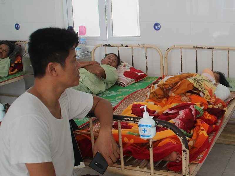 Người thân (ngồi) bên cạnh anh Huỳnh Chí Đôi tại BV đa khoa tỉnh Bình Định.