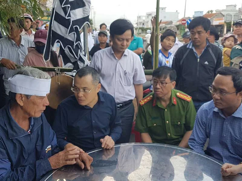 Ông Khuất Việt Hùng, Phó Chủ tịch chuyên trách Ủy ban An toàn giao thông quốc gia (phía ngoài, bên phải), hỏi thăm, chia buồn cùng người thân nạn nhân Nguyễn Thị Bảo Linh. Chị Linh là giáo viên Trường THCS Trần Kiệt, xã Hòa Hiệp Nam. Ảnh: TẤN LỘC
