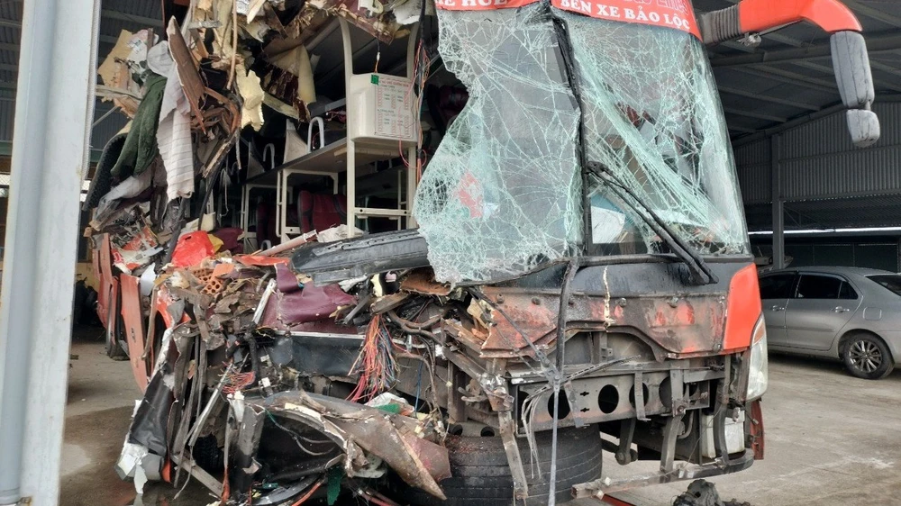 Cú tông mạnh khiến đầu xe khách dính chặt vào đuôi xe tải và biến dạng. Vụ tai nạn làm ba người chết và 13 người bị thương.