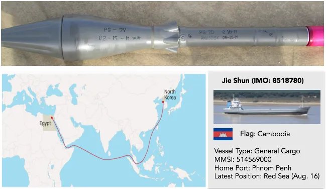 Một trong các súng phóng lựu (trên cùng) bị thu giữ, hải trình (trái dưới) và thông tin của tàu Jie Shun. Ảnh: C4ADS
