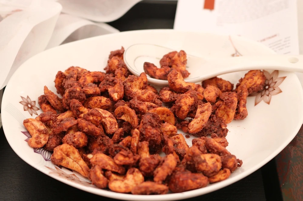 Sản phẩm hạt điều được chế biến hòa quyện vị quế được trưng bày tại hội nghị quảng bá sáng nay. ẢNH: THANH TUYỀN.