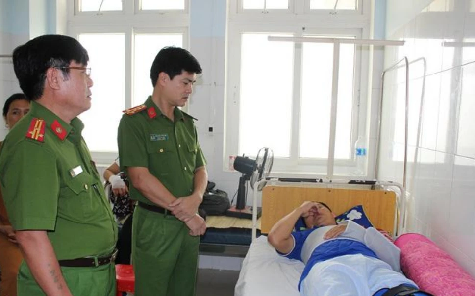 Lãnh đạo Công an tỉnh Nghệ An thăm hỏi Đại úy Trần Xuân Sơn. Ảnh: NTV.