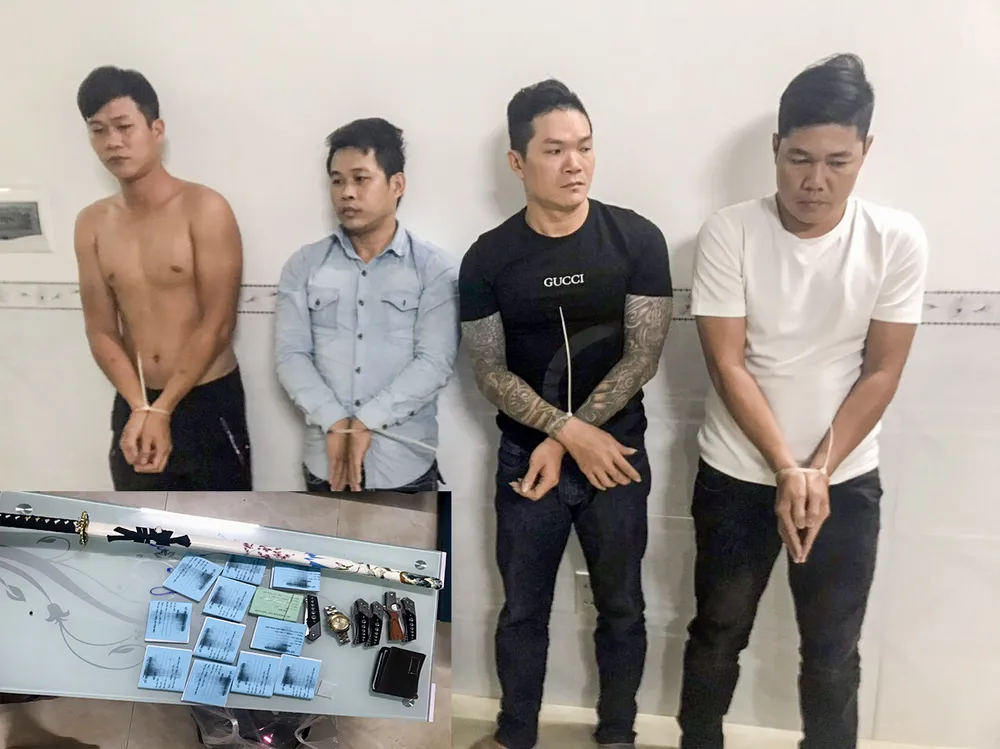Bốn đối tượng trong vụ hỗn chiến vừa bị bắt khi đang lẩn trốn ở Kiên Giang (ảnh lớn) và các tang vật (ảnh nhỏ). Ảnh: CACC