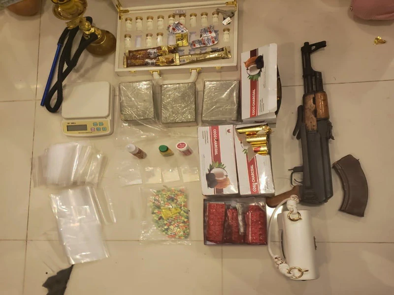 Tang vật thu giữ tại hiện trường gồm một khẩu súng AK báng xếp; một khẩu súng ngắn, hai băng đạn, ma túy và nhiều tang vật khác.