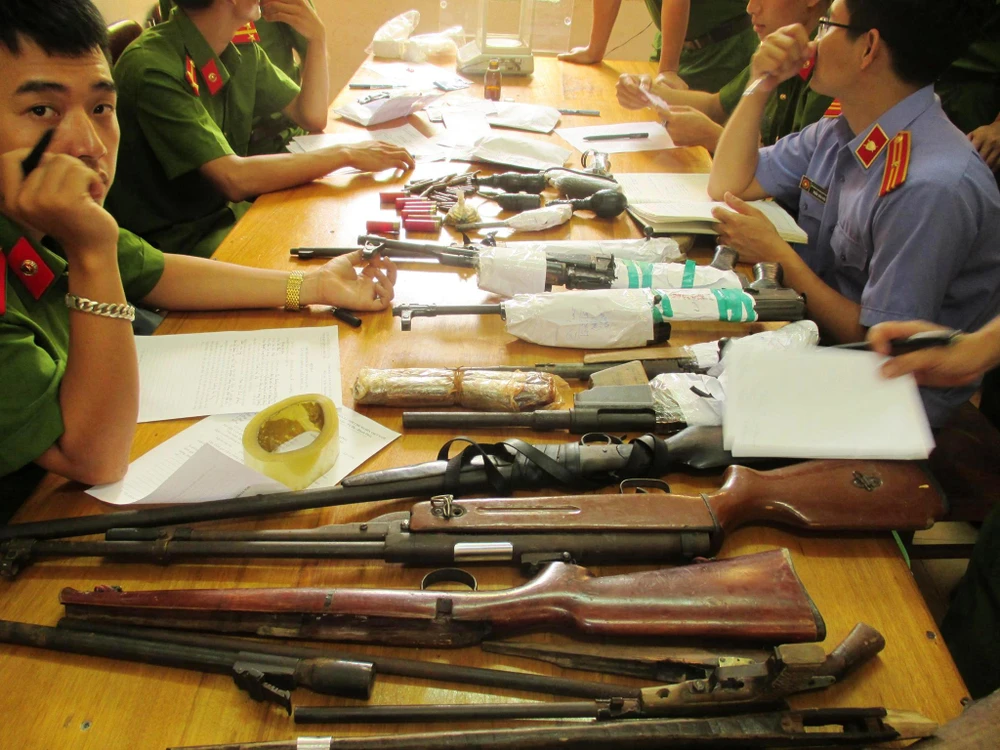 Tang vật công an thu giữ năm gói heroin, 100 viên hồng phiến, một khẩu súng quân dụng K59 cùng sáu viên đạn K59, hai khẩu súng săn, bốn viên đạn súng tự chế.